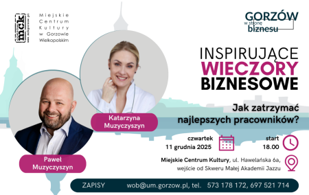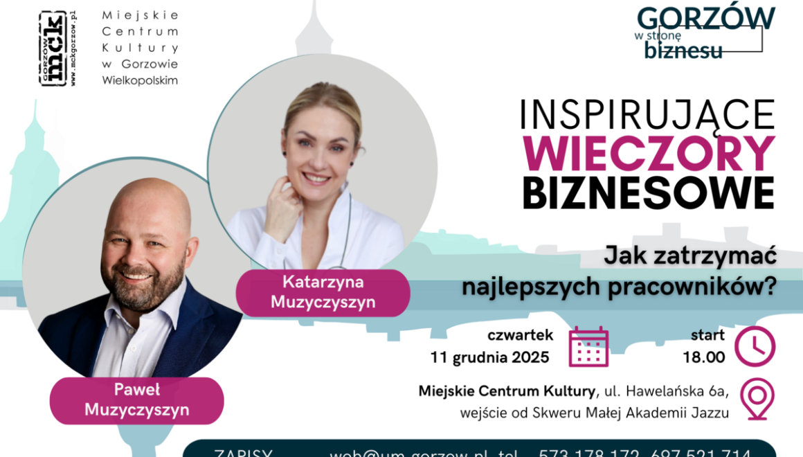 Jak zatrzymać najlepszych pracowników? Na to pytanie odpowiemy sobie podczas ostatniego w tym roku spotkania z cyklu Inspirujące Wieczory Biznesowe, organizowanego we współpracy z Collegium Da Vinci pod hasłem „Innowacja, inspiracja, integracja… klucze do sukcesu w nowoczesnym biznesie.” Zapraszamy 11 grudnia, o godz. 18.00 do Miejskiego Centrum Kultury.