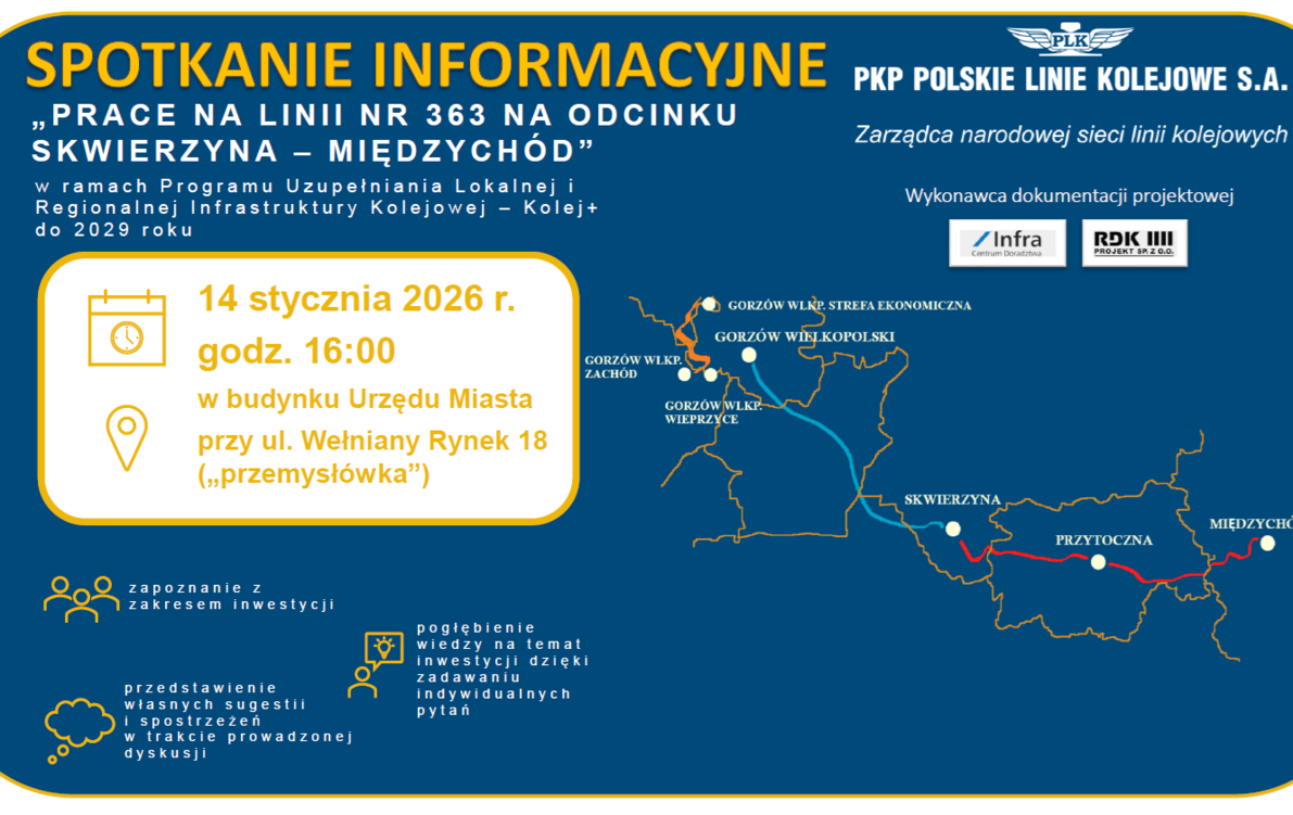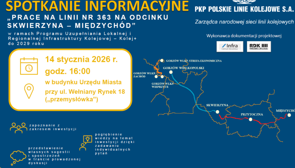 PKP Polskie Linie Kolejowe S.A. rozpoczęły konsultacje inwestycji pn. „Prace na linii nr 363 na odcinku Skwierzyna-Międzychód”. 14 stycznia 2026 r. o godz. 16.00 odbędzie się spotkanie informacyjne dotyczące tej inwestycji. Miejsce spotkania: Urząd Miasta , ul. Wełniany Rynek 18 (tzw. „Przemysłówka”) sala konferencyjna piętro 9.