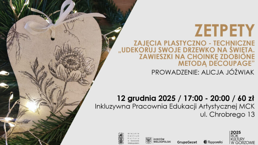 „Udekoruj swoje drzewko na święta. Zawieszki na choinkę zdobione metodą decoupage." Poziom podstawowy. Każdy uczestnik zabierze ze sobą zestaw zawieszek wykonanych podczas warsztatów. Liczba miejsc ograniczona. Prowadzenie: Alicja Jóźwiak.