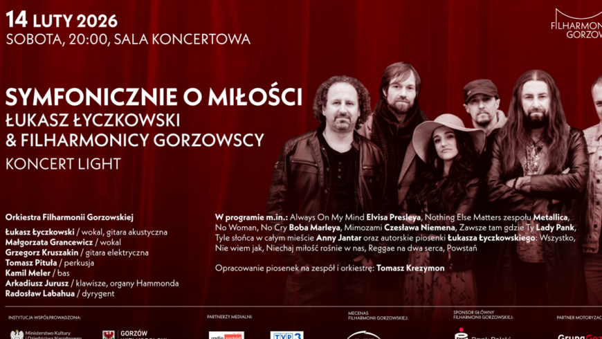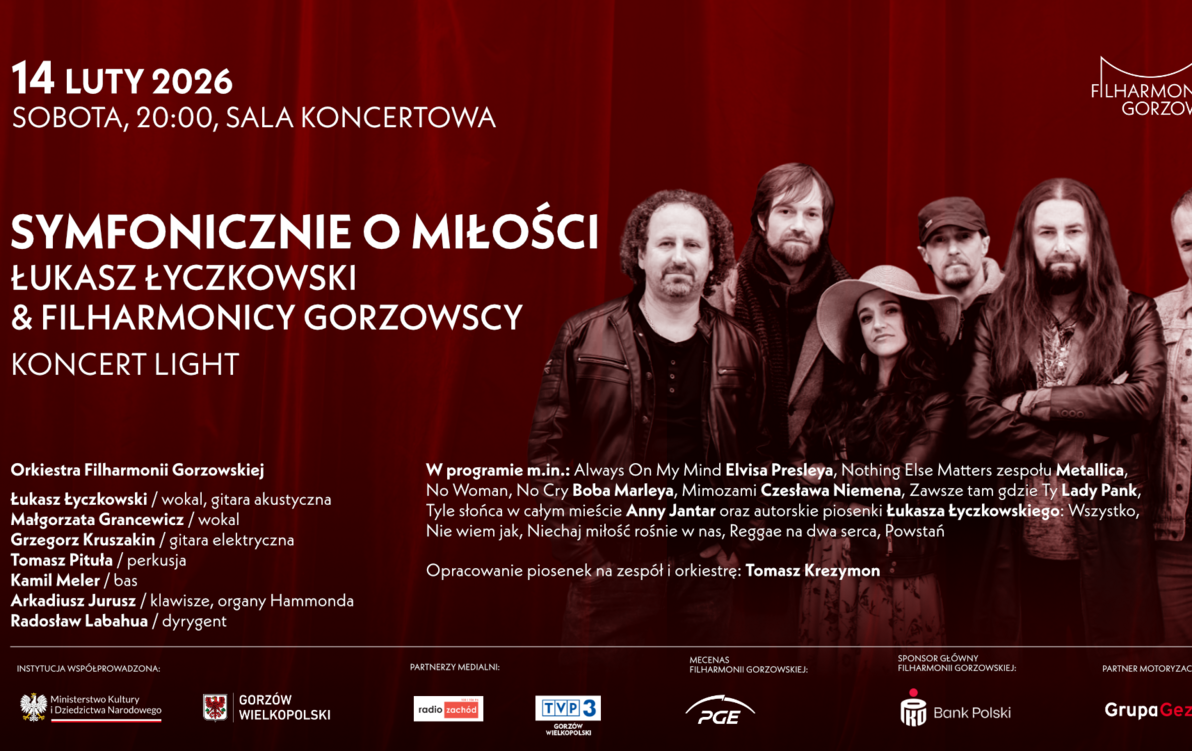 Rockowe ballady oraz inne klasyki o miłości w symfonicznej oprawie to nasza propozycja na walentynkowy wieczór. Na estradzie wraz z filharmonikami gorzowskimi wystąpi ze swoim zespołem charyzmatyczny wokalista Łukasz Łyczkowski, który po ponad 20 latach niesienia płomienia rock and rolla po całej Polsce spełnia artystyczne marzenie! Od zawsze zafascynowany koncertami wielkich zespołów rockowych z orkiestrami symfonicznymi, już jako dojrzały artysta postanowił połączyć najbliższy mu świat i swoją mocną, wyrazistą ekspresję z klasycznym orkiestrowym brzmieniem, stając się współtwórcą oryginalnej, elektryzującej fuzji. W programie koncertu autorskie kompozycje wokalisty, a także wyselekcjonowane na tę okazję rockowe evergreeny, które wywarły wpływ na jego muzyczną drogę, m.in. z repertuaru legendarnego króla rock and rolla – Elvisa Presleya, światowych gwiazd muzyki pop – Eltona Johna czy Lady Gagi, wielkiej ikony nurtu reggae – Boba Marleya, a także topowych wykonawców polskiej sceny muzycznej – Anny Jantar i zespołu Lady Pank. Wszystkie utwory zabrzmią w nowych, specjalnie na tę okazję stworzonych aranżacjach Tomasza Krezymona, które rockowej gitarowej energii dodadzą orkiestrowej głębi i koloru.