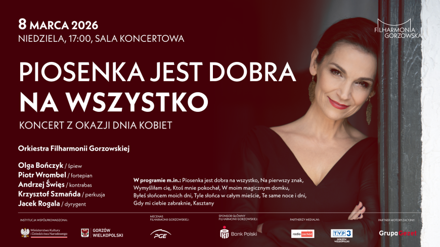 W Dniu Kobiet scena Filharmonii Gorzowskiej rozbrzmiewać będzie muzyką, która… jest dobra na wszystko. Program koncertu to zbiór ponadczasowych polskich piosenek, które zapisały się w sercach pokoleń, a dziś są okazją, by z sentymentem powrócić do lat 50., 60. i 70. Wśród nich znajdą się utwory z repertuaru Ireny Jarockiej, Marii Koterbskiej, Wojciecha Młynarskiego, Skaldów i wielu innych niezapomnianych artystów polskiej estrady –przefiltrowane przez współczesną wrażliwość i „podane” w eleganckiej, symfonicznej oprawie.