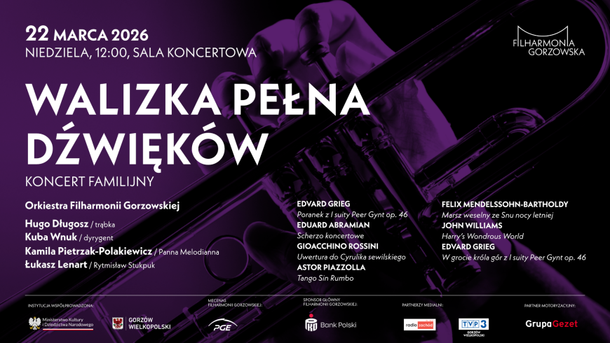Muzyka klasyczna to nie tylko dźwięki – to również kolory, krajobrazy i fantastyczne historie! Ten koncert będzie tego najlepszym dowodem. Razem z naszą orkiestrą i młodym utalentowanym trębaczem Hugonem Długoszem będziemy podróżować nie tylko po konkretnych kontynentach czy państwach, ale też do światów, których nie znajdziemy na żadnej mapie, pełnych tajemniczych zakątków i baśniowych istot. Usłyszymy charakterystyczne dla wybranych krajów melodie i rytmy, a także utwory inspirowane ich tradycją, kulturą i lokalnym kolorytem. Obejrzymy malowniczy wschód słońca w Norwegii, odkryjemy taneczne rytmy i melodie z dalekiej Armenii, do Włoch udamy się, by poznać jednego z najsłynniejszych twórców operowych, a ulice Buenos Aires przemierzać będziemy w rytmie tanga. Dzięki magii muzyki przeniesiemy się również do świata wróżek i leśnych duszków, odwiedzimy młodych czarodziejów w Hogwarcie, a na koniec – staniemy oko w oko z rozgniewanym trollem z norweskich legend. Podczas naszej muzycznej wędrówki przyjrzymy się nieco bliżej każdemu z odwiedzanych miejsc –sprawdzimy, kto je zamieszkuje, co ciekawego można tam zobaczyć i co smacznego zjeść.