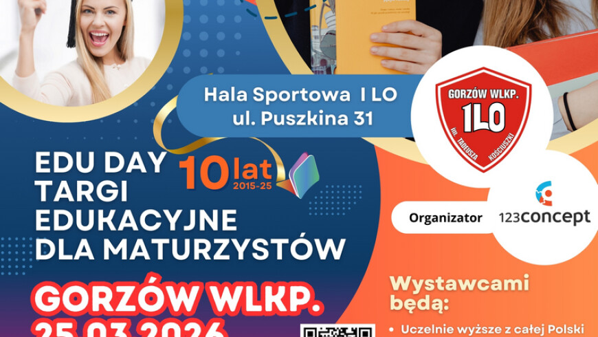 Już 25.03.2026r. w godz. 9.30-13.00 będziemy gościć w Gorzowie Wielkopolskim na hali sportowej I LO przy ul. Puszkina 31. Edu Day to największe targi tego typu w tym rejonie kraju. Pierwsze targi odbyły się w 2015 roku w Koszalinie.