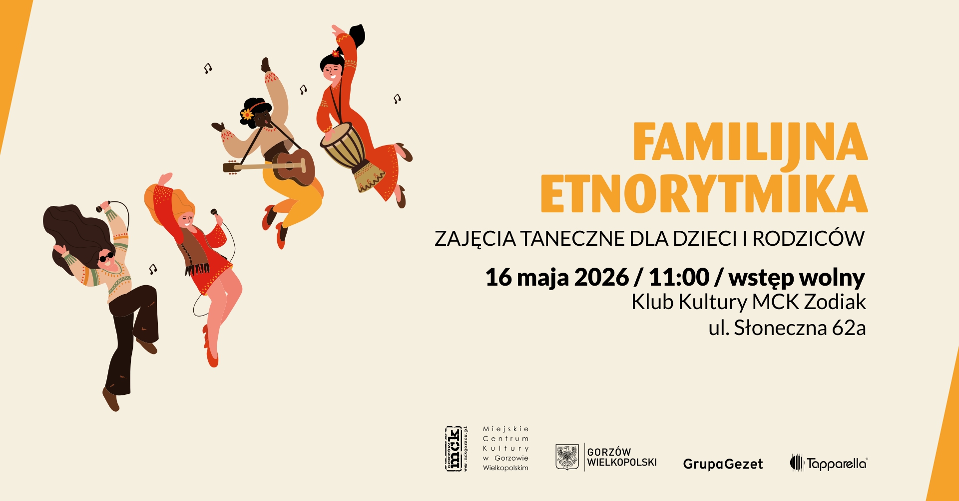Familijna Etnorytmika to podróż do różnych zakątków świata, by wspólnie odkrywać niezwykłe barwy muzyki i tańców, które inspiracje czerpały ze świata przyrody oraz codziennego życia. Muzyka etniczna, ludowa oraz folkowa to uzewnętrznienie brzmień duszy oraz serca, zaś taniec to realizacja tego poprzez ruch. Na tych zajęciach poznacie także różne instrumenty z całego świata, będziecie mogli na niektórych zagrać.